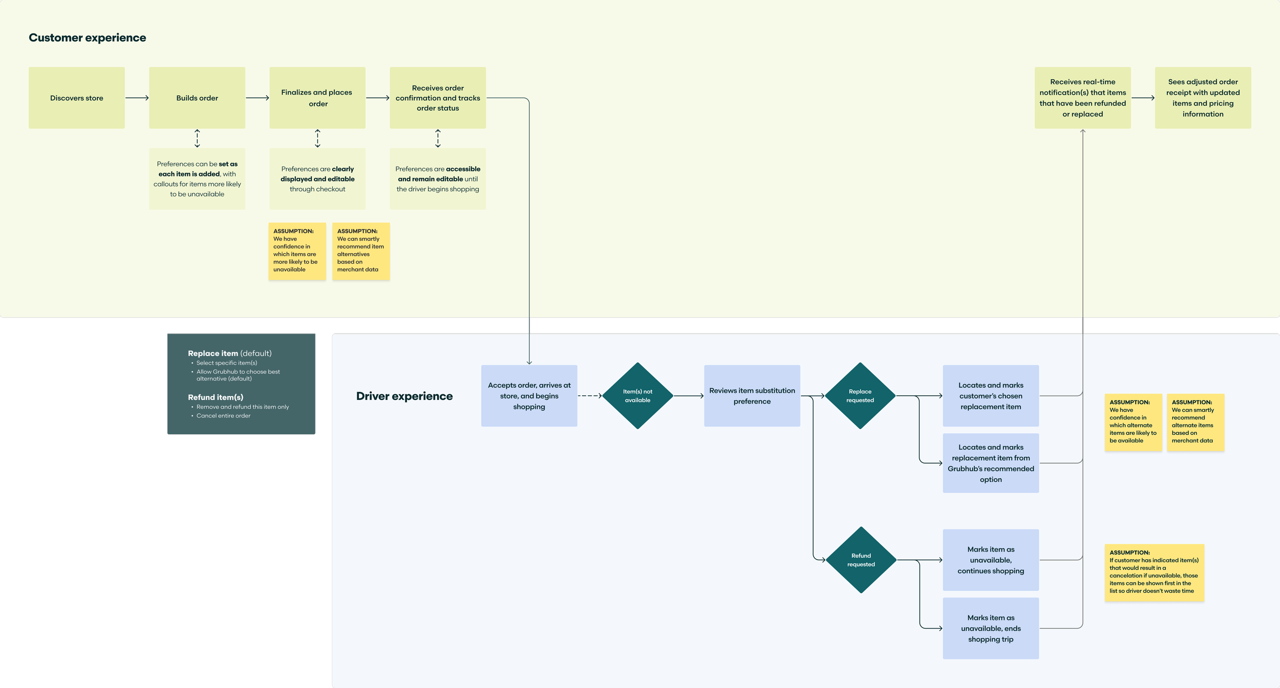 To avoid overwhelming customers with too many decisions at once, I also wanted to include default substitution options (i.e., Grubhub recommendations). Customers could quickly opt in without selecting specific replacements for every item, and item previews still provided transparency. Framing them as Grubhub’s choices also helped set expectations and eased pressure on drivers.