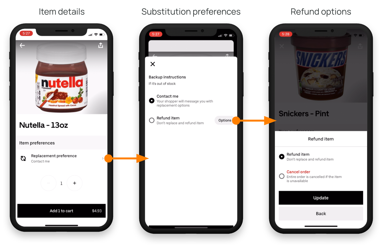 Customers have the option to approve specific replacements, request driver contact, or receive a refund for each individual item.